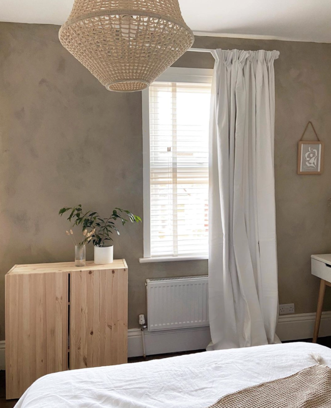 Using Stone Effect paint and a selection of natural textures and materials, Georgia's bedroom takes on a cosy, washed vibe.