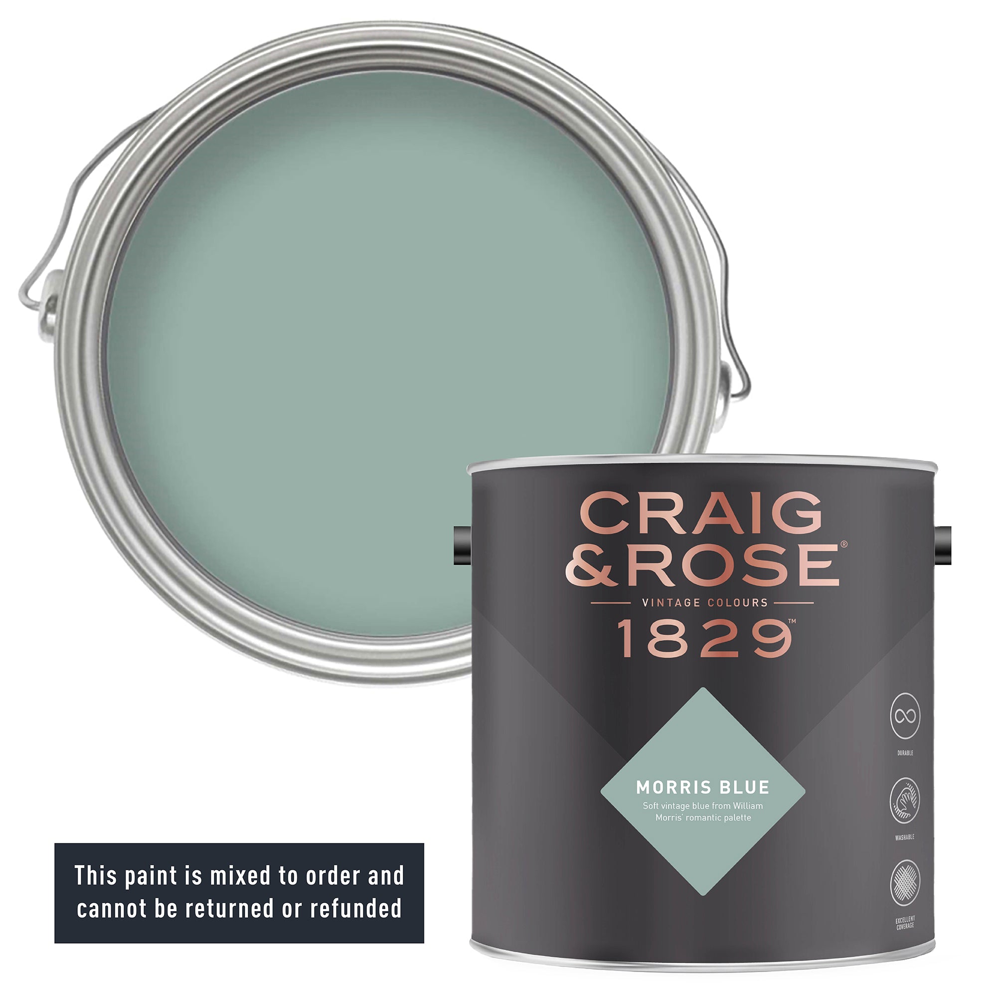 Starling egg. This sophisticated and compelling blue paint evokes a sense of stillness yet harnesses the energy of nature. Like its pioneering namesake William Morris, Morris Blue weaves together the vibrance of luscious flora and fauna with a rich mineral gemstone opulence that completes its luxurious downy feel. Perfect for bold statements with full coverage or to freshen up a space with textural colour blocking.